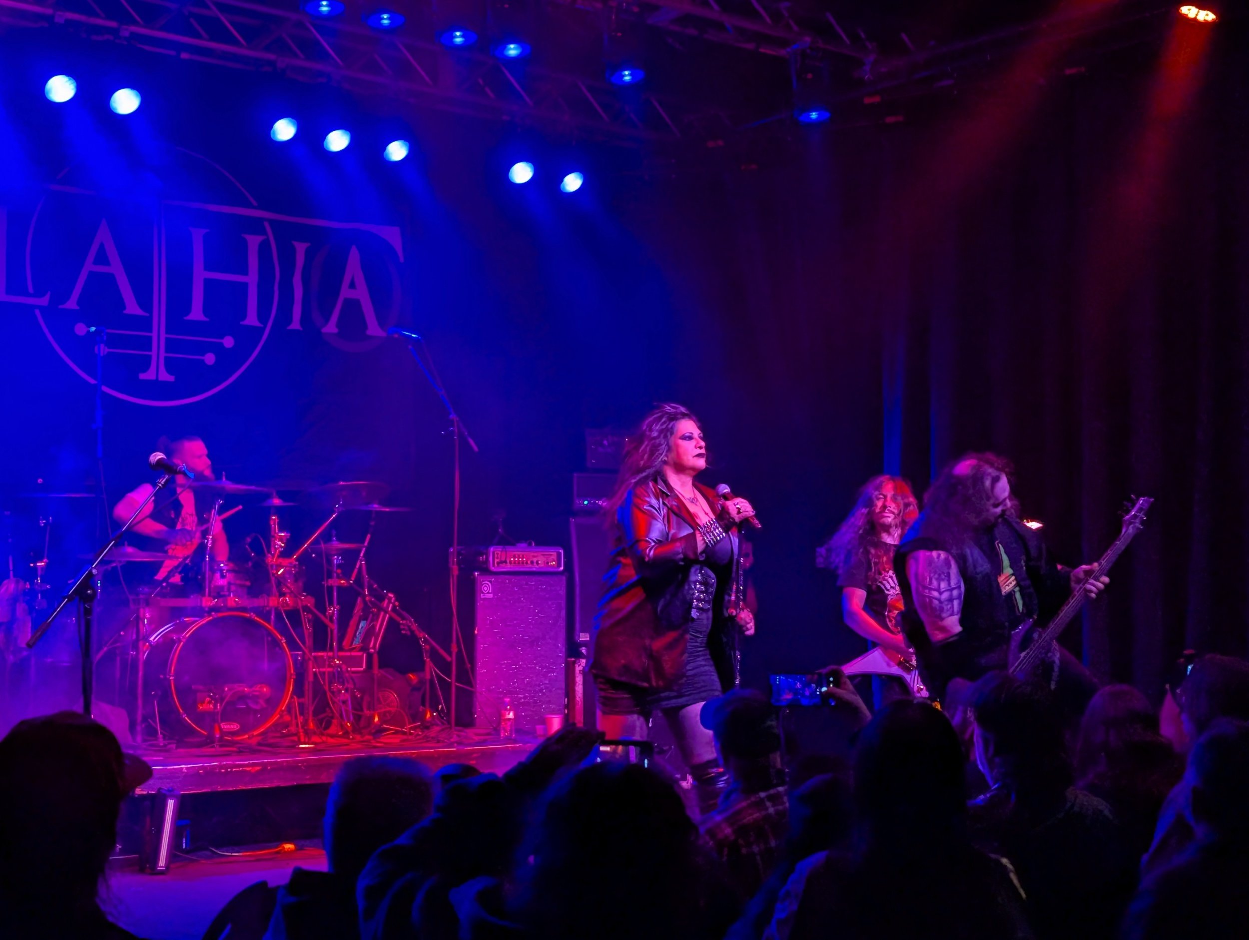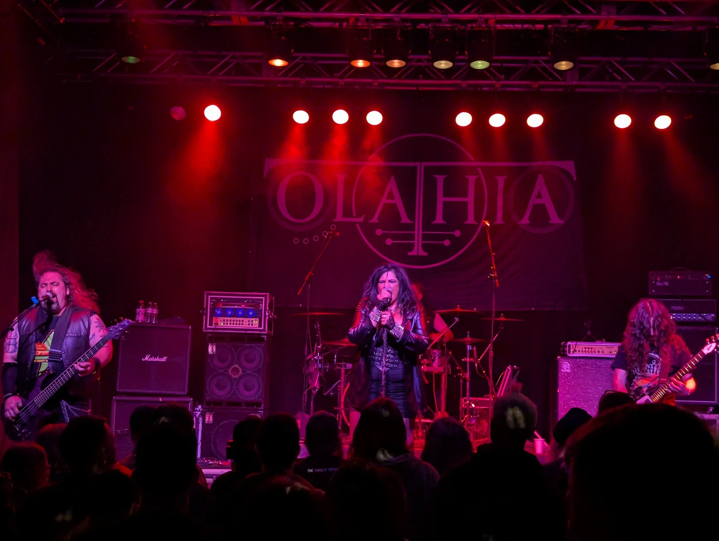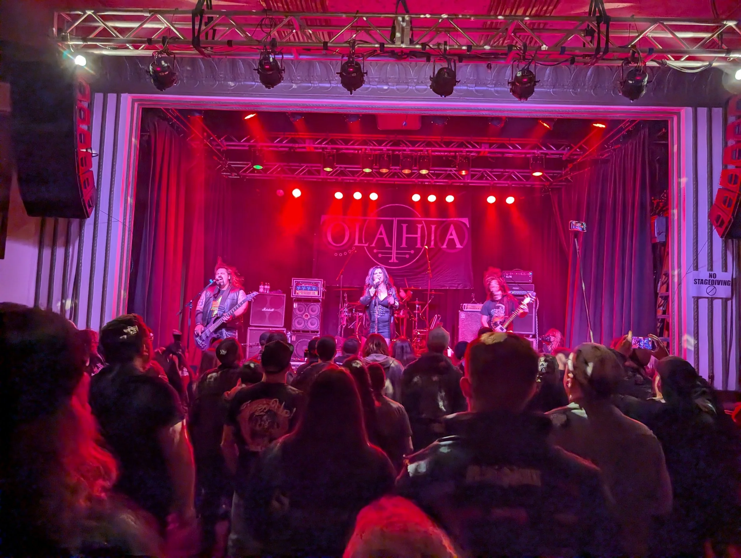 Finishing our chat we returned to the Ballroom just in time to see Olathia take to the stage. This four person, female fronted powerhouse is Cleveland’s resident super group and the hosts of Shotgun Bowl. They are known for their amazing musicianship. Stacked at every position, Olathia has talent to burn. Led by the unstoppable Vocalist Chris; her siren song is unbelievable as she switches from melodic notes to shrill screams in an instant. Beside her is the Bass master Terry the Bull. A beast on the stage, his performance antics are unrivaled. Across from him is Cleveland’s resident shredder, the six string samurai Dylan. His fingers move with speed and precision at each and every combustible step. And of course behind the kit is Joe, human metronome who hits with all the power of a runaway truck. These four elements come together and fit into a perfect configuration. The end result is one of the most intriguing and respected Power Thrash acts in the Scene. With fog drifting about the stage they opened up with “Who’s the Devil?” Olathia was not messing around. This is without a doubt among their heaviest of tracks, and one hell of an opening number.