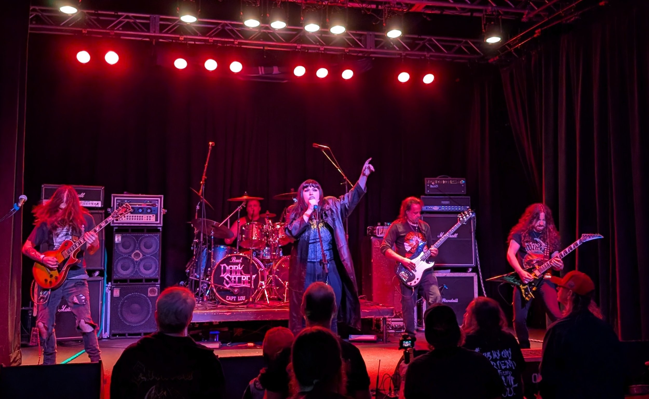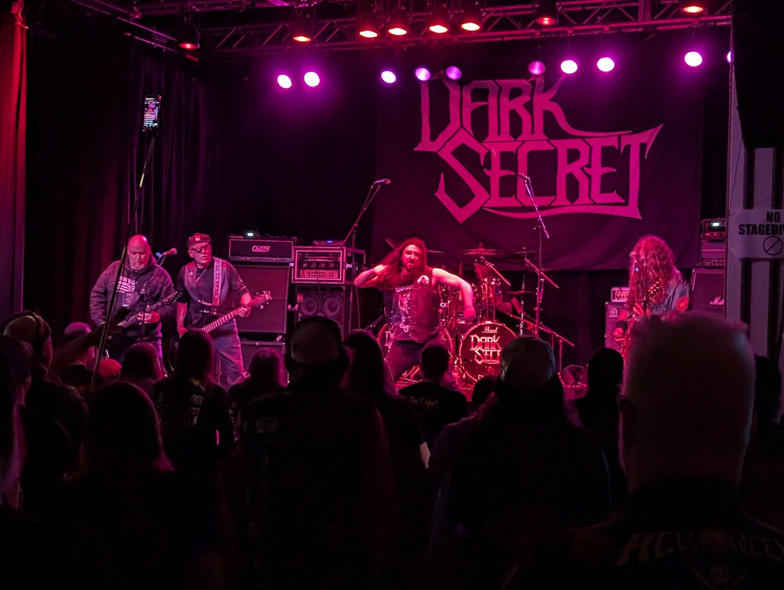 After a brief interlude we again gathered in the Ballroom for our second act, Dark Secret. This is a five man band made up of a Vocalist, two Guitars, Bass and Drums. I would put them somewhere in the realm of Traditional or Power Metal with some definite Thrashy elements. They utilize clean Vocals, with some operatic flourishes. They had Rockin’ riffs, driving tempos and very nice solos. They brought strong stage presence, especially their frontman who was in continuous motion. On songs like “The Extremist,” “Patriarch’s of Science” and the epic ballad “Silence” they thoroughly Rocked the Ballroom. I believe they played a total of six songs before calling it a set. The crowd screamed in approval and Dark Secret took their final bow. After some closing remarks from Jay Stone we spun on our heels and made for the tavern.