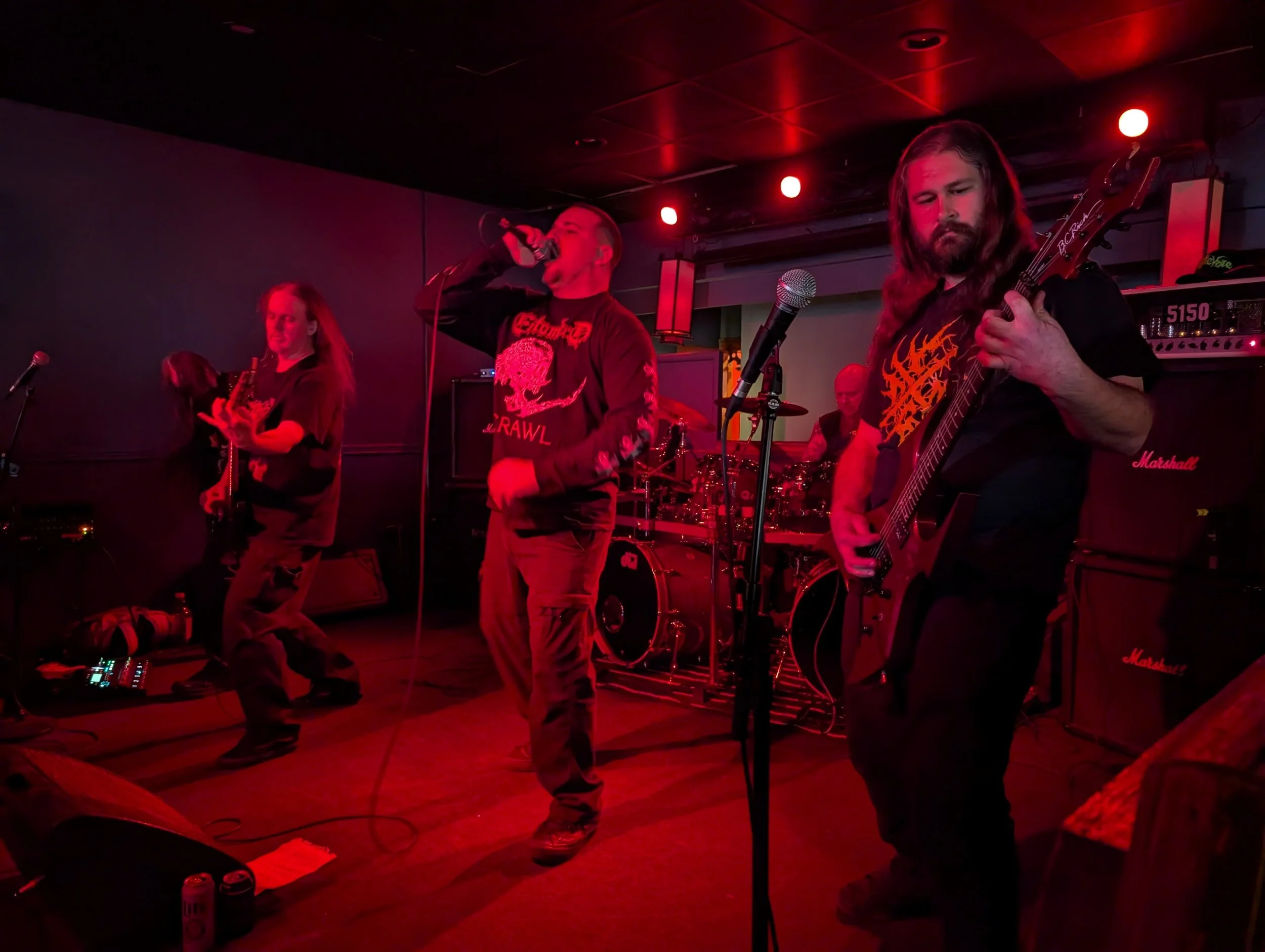Our sixth performance of the day had erupted: Indiana’s Idol Throne had taken the stage like a hurricane, and when I entered the room we were in the peak of the storm. I made a quick assessment of the band and jotted down their stats: yet another configuration of a Vocalist, two Guitars, Bass and Drums. The sound was amazing, and I was into it immediately. The riffs were Thrashy and rippin’. The Vocals were clean yet with a raw edge, powerful and energetic. The singer was very animated, moving all about the stage interacting with both his bandmates and the crowd. The Guitar work was uncanny, shredding and intense. Across the board they had a powerful heaviness intertwined with an undeniable charge that kept the crowd engaged. It was excellent, hands down. This was my one big regret about SB4; was that I missed a portion of this set while I was doing my thing. It was a bummer, because what I saw of Idol Throne was amazing. They were like a hammer coming down again and again. The fans ate it up bite by bite. Based on the four songs I saw they are one of the must see acts touring around the American Midwest in this modern era. I highly recommend you check them out. With Idol Throne saying goodnight to the crowd it was once again back to the Tavern.